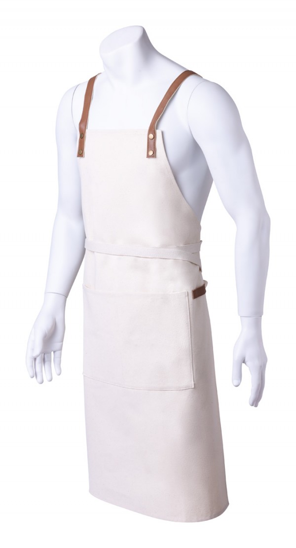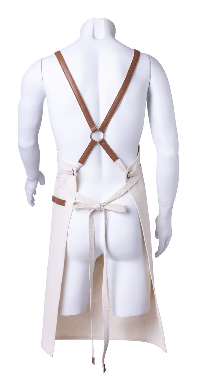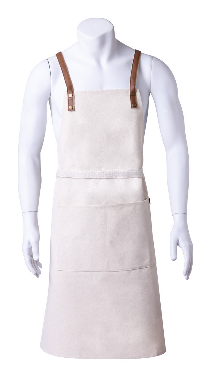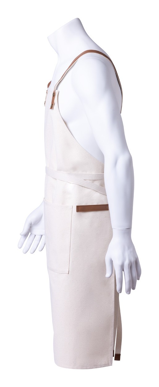 Șorț din pânză de bumbac 100%, cu 2 buzunare frontale, accente din piele PU și bretele reglabile. 340 g/m².