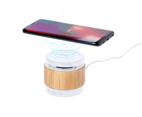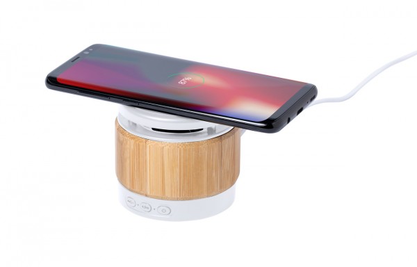 Boxă Bluetooth în carcasă din bambus și plastic, cu încărcător mobil wireless încorporat și baterie reîncărcabilă. Inclusiv cablu încărcător USB.