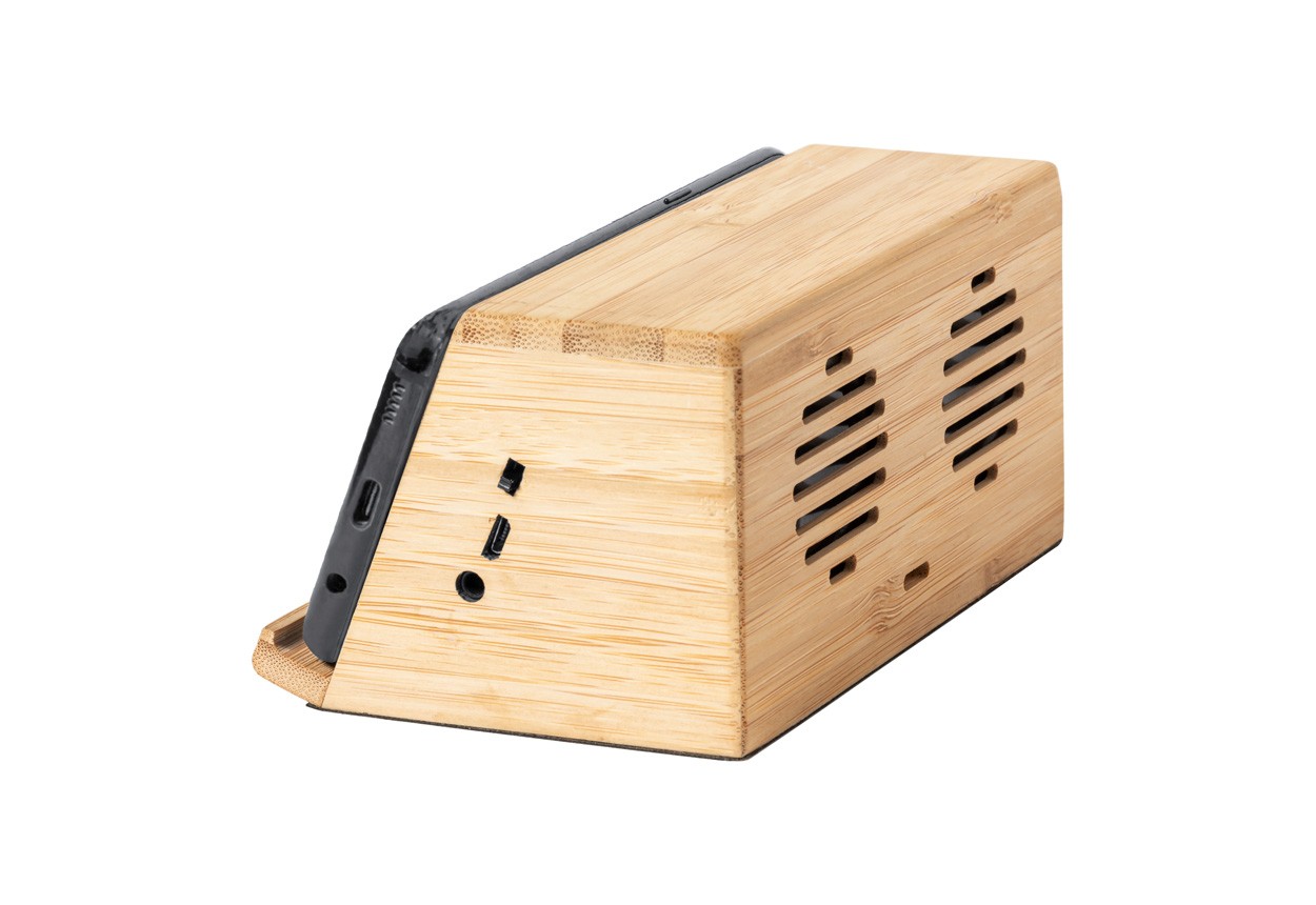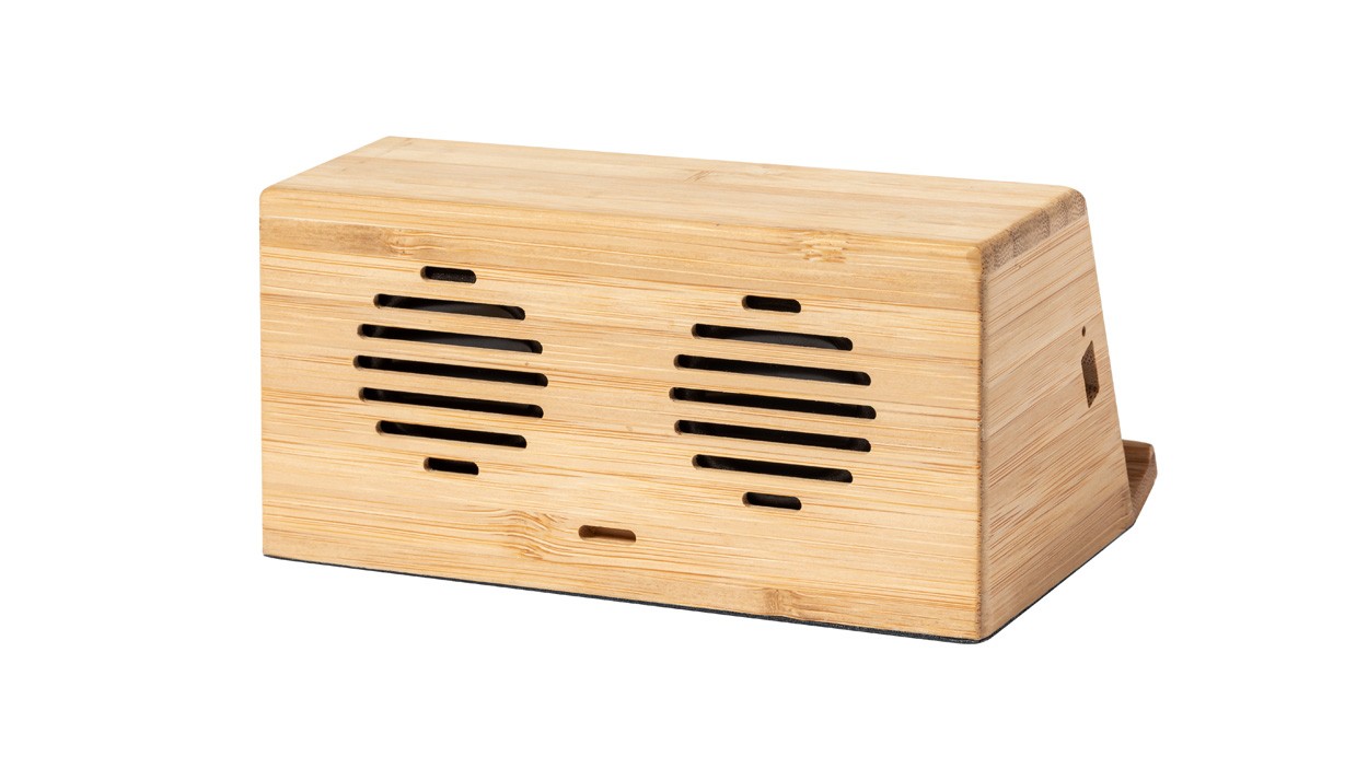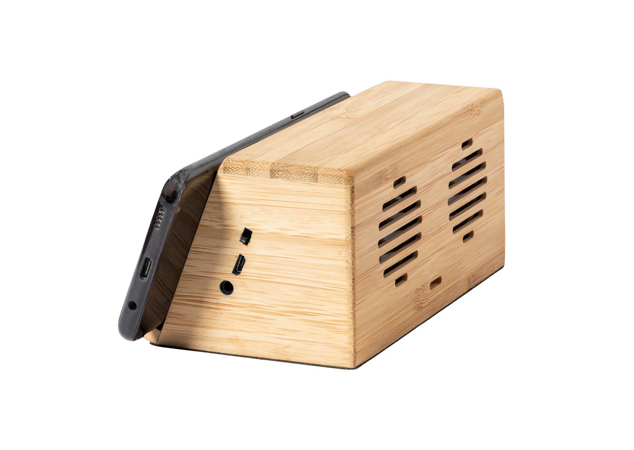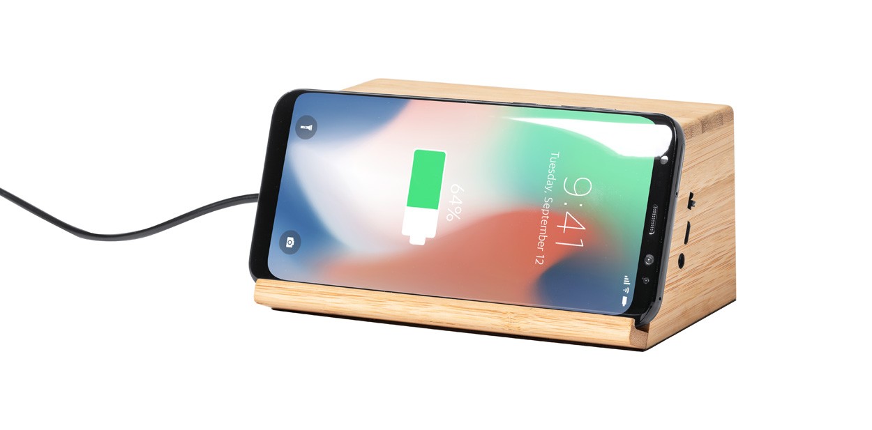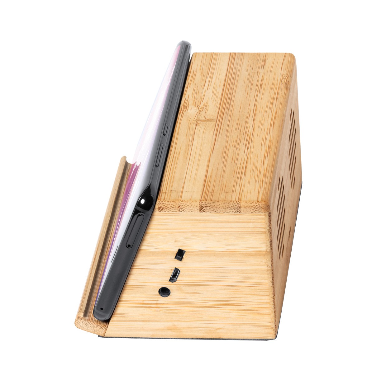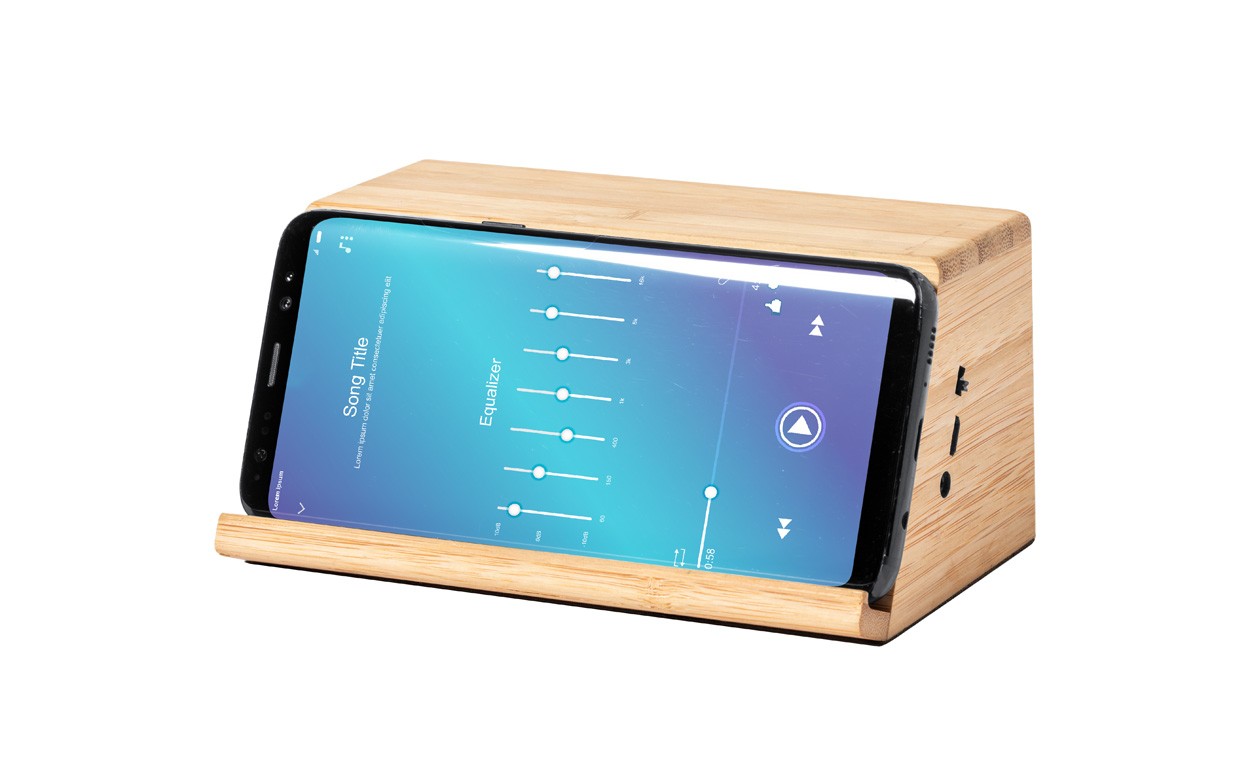 Difuzor bluetooth din bambus cu suport mobil, încărcător rapid fără fir încorporat (10W) și baterie reîncărcabilă. Inclusiv cablu de încărcare USB.