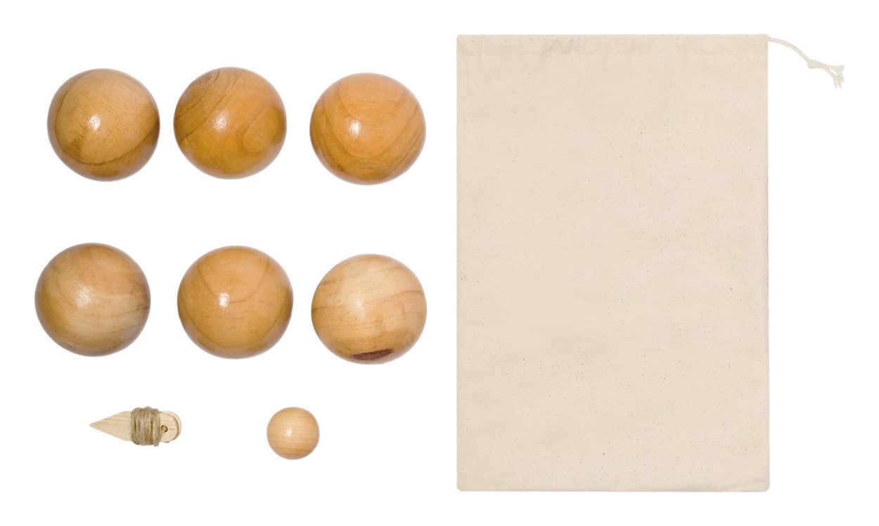 Set joc de petanca, din lemn, cu 6 bile. În husă din bumbac, cu șnur.