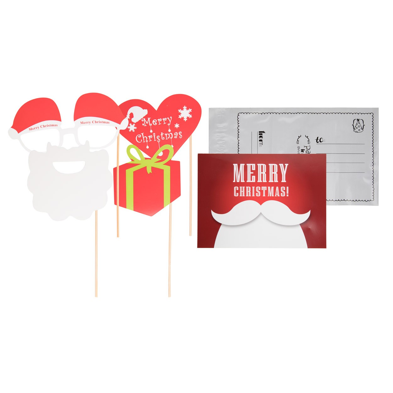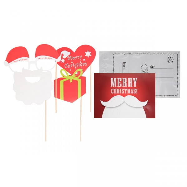 Set selfie de Crăciun, 4 accesorii de recuzită poze și o carte poștală într-un plic cu design de Crăciun și pungă individuală.