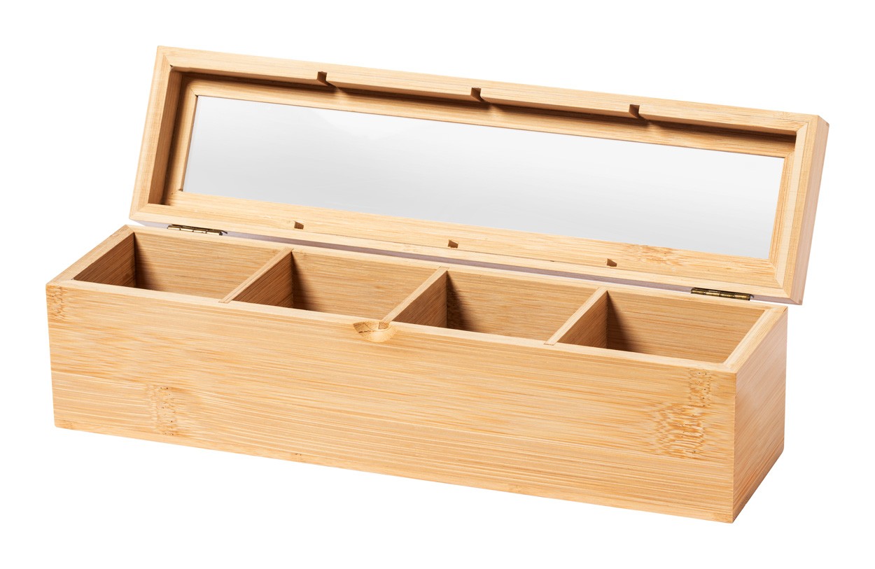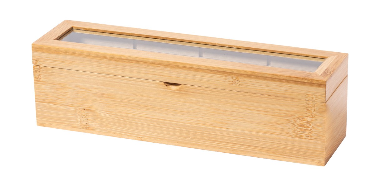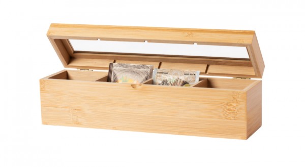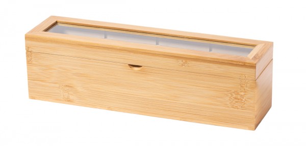 Cutie de depozitare pentru ceai, din bambus, cu capac transparent din sticlă și 4 compartimente.