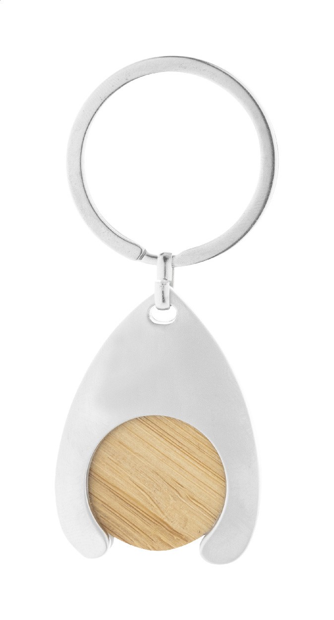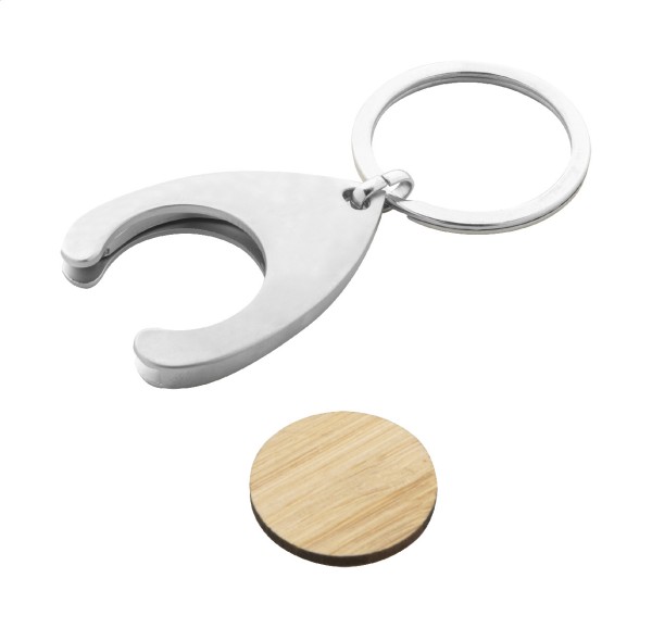 Breloc metalic, cu monedă din bambus pentru cărucior de cumpărături și inel metalic. Dimensiunea monedei: ø23×2 mm.