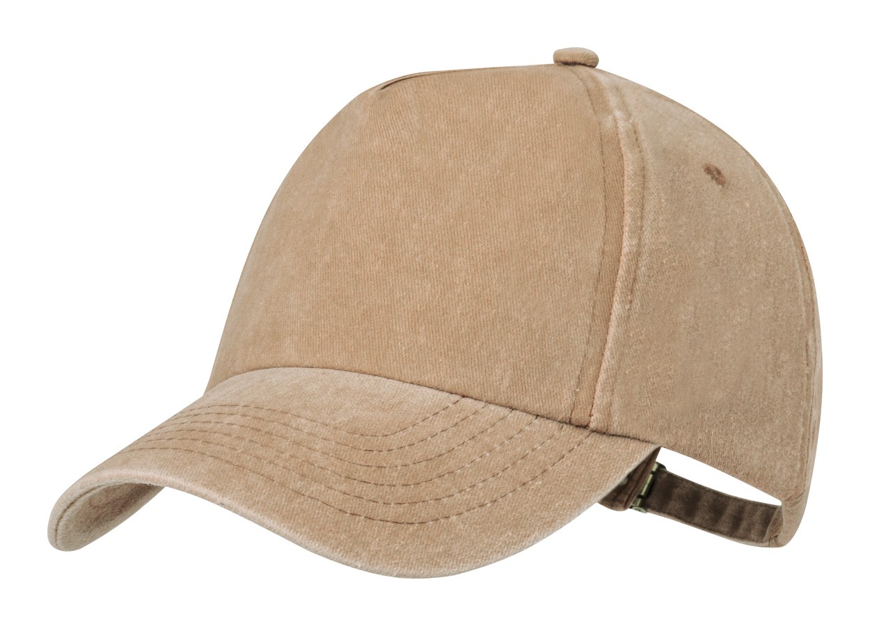 Cotton baseball cap with 5 panels and buckle closure.