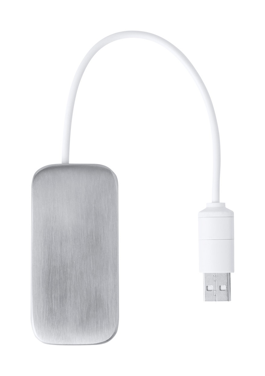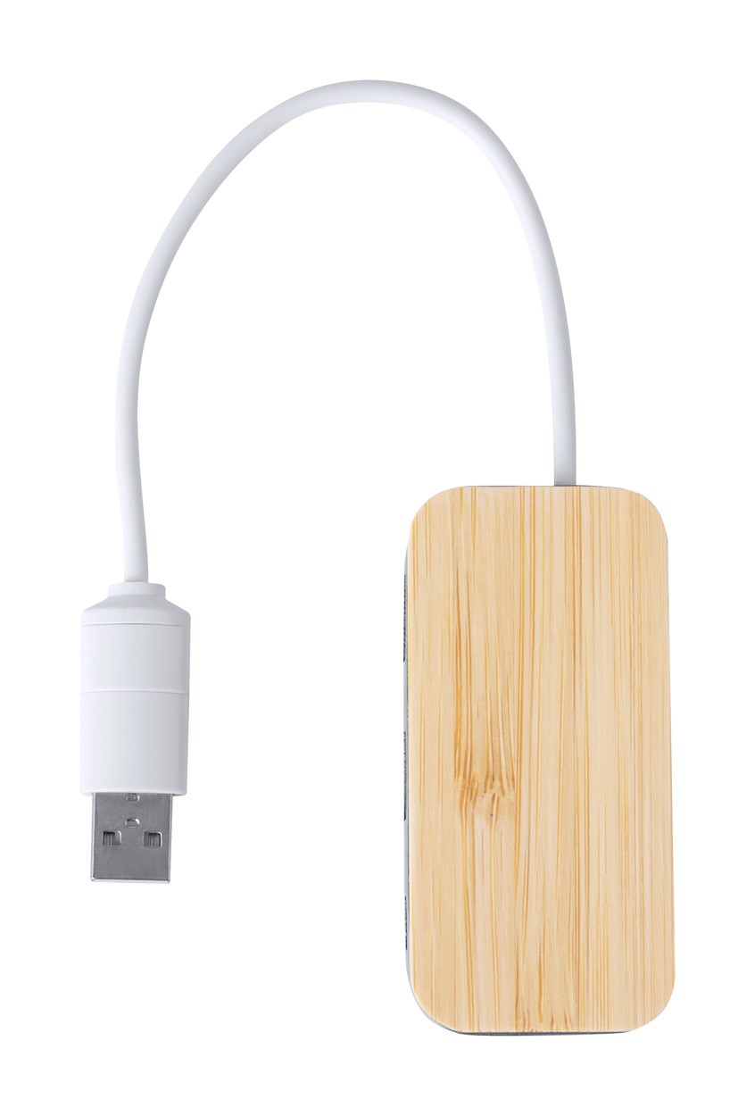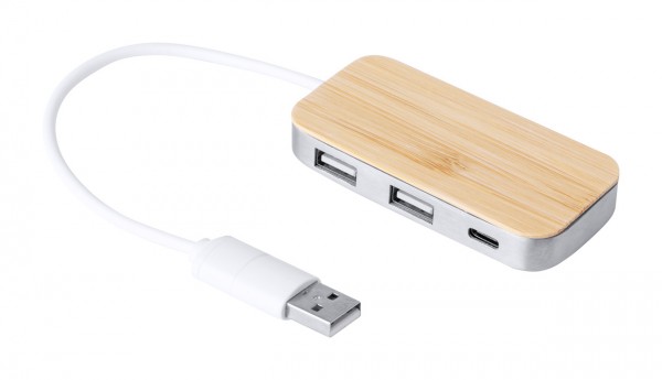 USB hub in recycled aluminium and bamboo. With 2 USB and 1 USB-C ports, USB 2.0. Including cable with USB and USB-C connections.